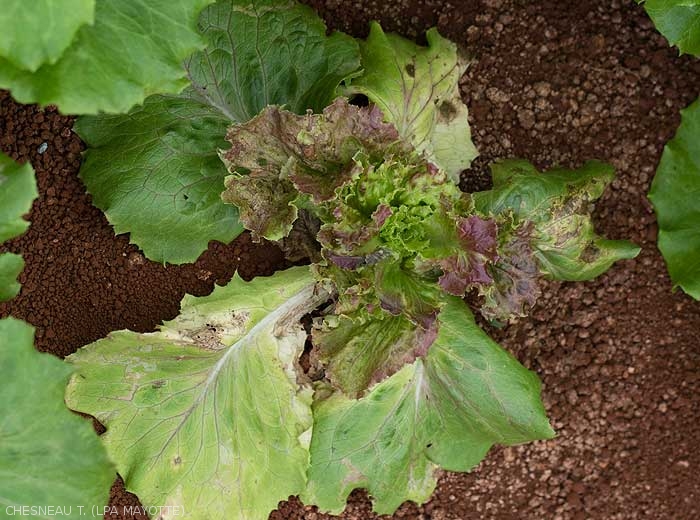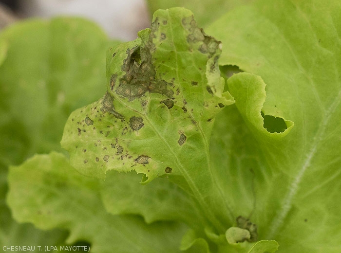 - Small chlorotic to necrotic leaf spots, presence of brown rings (figures 1 and 2-salad). The necrotic spots coalesce and lead to necrosis and drying out of the blade sector (figure 3 salad) or of entire leaves.