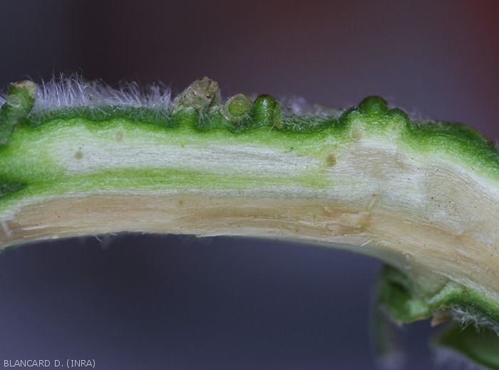 - More or less marked browning of the vessels of the lower part of the stem extending over time and reaching the branches.
