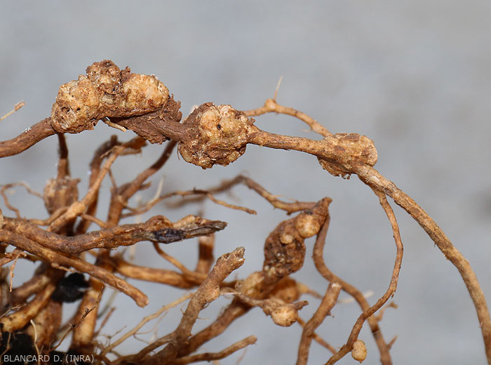 - Development - Dissemination : Once in place, they multiply abundantly and actively disrupt the physiology of the plant: rapid and anarchic division of the surrounding plant cells, overproduction of growth regulators which cause cell proliferation, hormonal imbalances, reduction in blood pressure. root absorption of water and nutrients, etc. Transmission by water and contaminated soil particles to other plants or crops. Workers in the course of their activities in the fields, with tillage machinery on wheels loaded with clods of earth, can ensure the dispersion of these bacteria. They are found in the substrates and nutrient solution of soilless crops. It is not impossible that it could be disseminated by the latter.