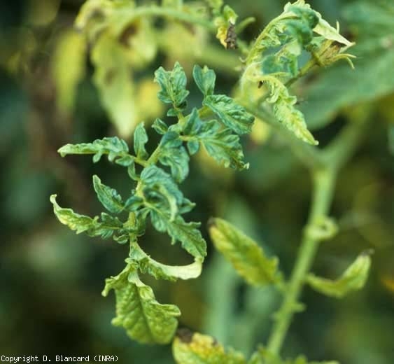 This virus causes thinning and yellowing of the veins of young leaflets. The latter are also small, distorted and coiled (Figures 2 to 5). Plant growth is reduced or even blocked. They end up being sterile, and the growing fruits become poorly colored and more or less wrinkled to blistered (Figure 6).