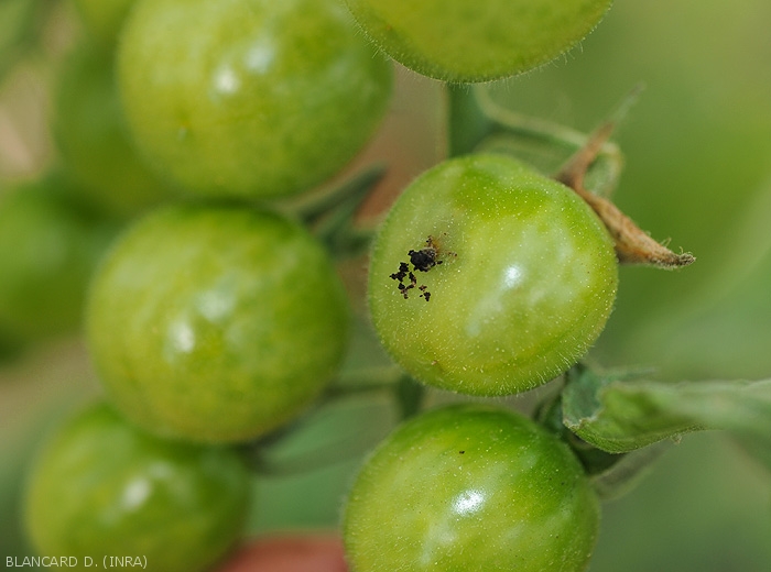 The larvae of T. absoluta dig mines and galleries on the aerial organs of the tomato. The leaves show mines, irregular whitish spots gradually becoming brown and necrotic. Only the tissues of the mesophyll are affected, the epidermis remains intact. Heavily parasitized leaves can completely necrode. Green fruits, like ripe fruits, are parasitized; they are more or less strewn with galleries and exit holes. These sometimes allow secondary invaders to cause various rots, during cultivation and during their conservation. Note that parasitized fruits are often unsalable. Galleries may appear on young stems, disrupting plant development. Black feces are visible here and there on the affected organs; they also materialize the actions of this pest.