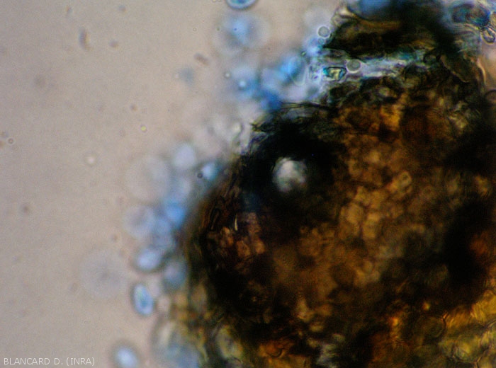 - The imperfect shape produces pycnidia spherical (59-196 µm in diameter), solitary, protruding, black, opened by an ostiole (figures 5 to 9) from which the will escape when ripe pycniospores (figures 10 and 11). These pycniospores are colorless, ovoid (4.5-9.3 x 4.5-5 µm) embedded in a mucilaginous cord (cirrh) of whitish color (figure 7).