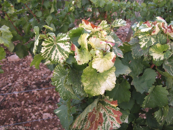 The leaves growing on diseased vines show various abnormalities in color and shape. We can therefore observe variegations or mosaics of golden yellow color located initially along the veins and then generalizing to all or part of the leaf blade. Sometimes rings or lines are visible by transparency on the young leaves. Anomalies in the morphology of the limbus are also observed: aberrant venation with asymmetries, double or irregularly cut leaves or with a more marked indentation.