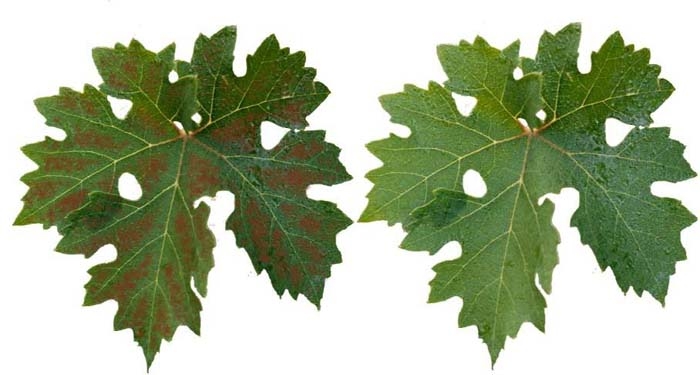 Leaves : accumulation of anthocyanins in the petioles and veins which take on a purplish tint, while the blade becomes darker. Modification of plant habit and premature defoliation (figure 8). Berries : decrease in size and number of berries. |