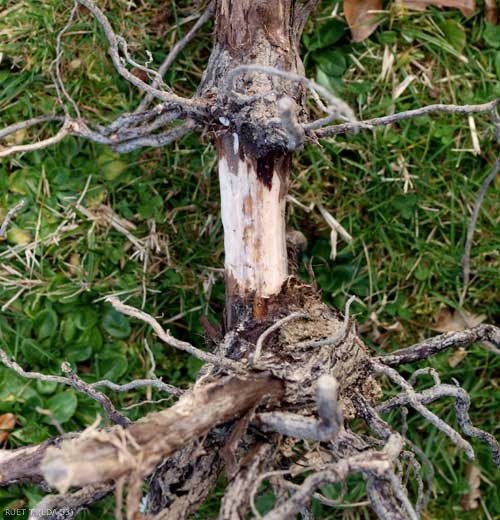 - limited development and extension of the roots of the first plateau, often parallel to the soil surface indicating difficulty in exploring the soil in depth. Note that the roots are often more or less necrotic and present a grayish to black color (Figure 4). The bark crumbles easily and an area of brown necrosis extends more or less from the heel to the point where the graft is welded.