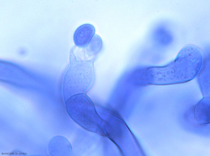 Development, sporulation : formation of mycelium that travels on the tissues and on the ground, and reaches other healthy organs. Sclerotia, mixed with soil particles contaminating different materials, also contribute to its spread. Production of basidiospores formed on basidia present on the surface of the hymenium.