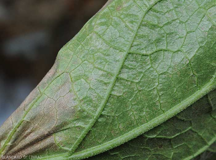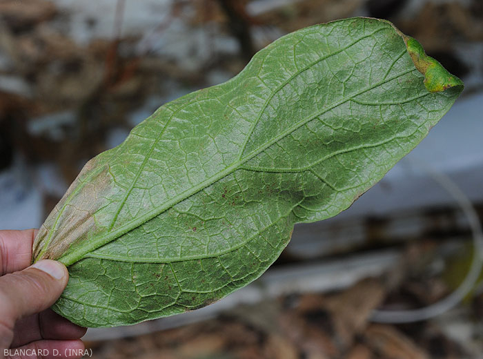 Brown to bronzed coloration of the leaves (figures 3 and 4), petioles and stems (figure 5) at the origin of the name of this problem.
