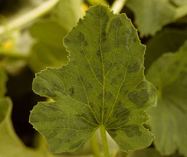 - In melons : Symptoms on foliage can be a more or less strong mosaic often accompanied by a dark green color along the veins (called vein-banding) and a slight twitching of the foliage (figures 1 to 3). Sometimes the symptoms are much more pronounced and there can be a dramatic reduction in the size of the leaves (Figures 4 and 5) which may not reach more than one or a few centimeters in length and be very distorted. The growth of the twigs does not appear to be affected which can give a particular appearance of a leafless twig.