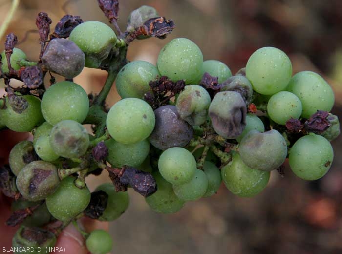 <b> <i> Plasmopara viticola </i> </b>: symptom of "gray burp" on immature berries.  The mildew agent sporulated heavily on the latter once colonized.