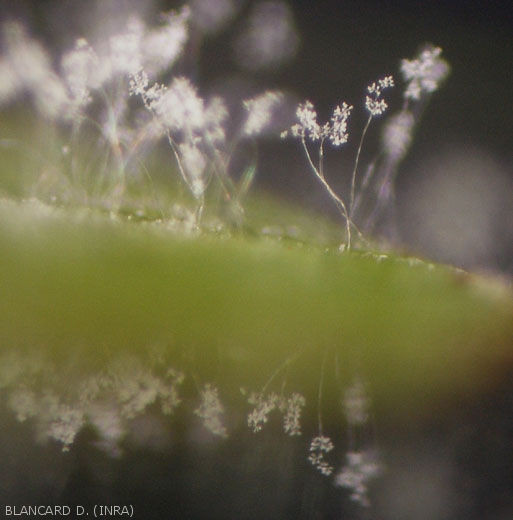 Arbusculous sporangiophores of <b> <i> Plasmopara viticola </i> </b> observed with a binocular magnifying glass.  (mildew)