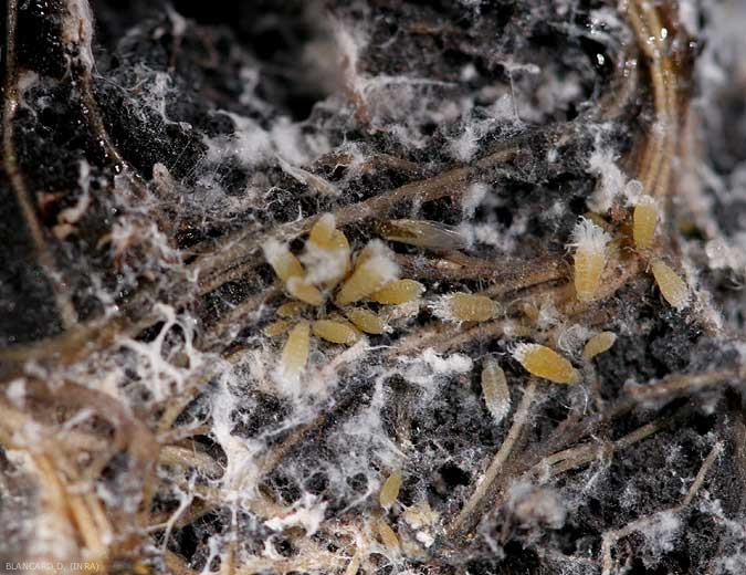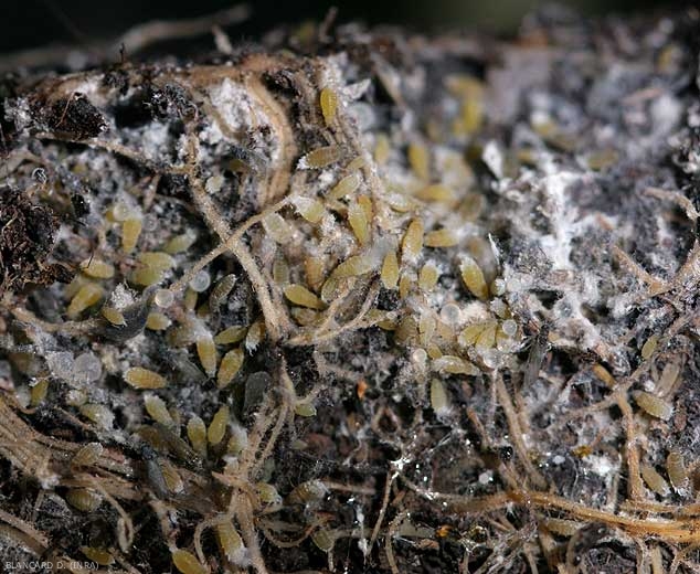 Por lo general, los ataques de este pulgón pasan desapercibidos; Es especialmente durante el desarraigo del cultivo cuando se observa el daño de la raíz: desarrollo de muchísimos insectos de color blanco amarillento a lo largo de las raíces, estos llevan un mechón bastante llamativo de cera blanca. Su presencia da la impresión de que un cabello blanco o ceniciento se mezcla con las raíces (Figuras 1 a 4). Las raíces atacadas se vuelven marrones al principio y mueren.