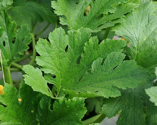 La mielada también se produce en grandes cantidades. Este es luego colonizado por los hongos oportunistas responsables de la fumagina (figura 2). El moho producido cubre la superficie de los órganos aéreos de calabacines y calabacines y los tiñe; las frutas a veces se vuelven inadecuadas para la comercialización.