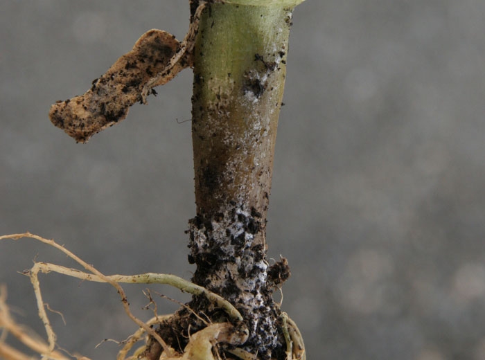 La porción del tallo cerca de la superficie del suelo está cubierta por un micelio de color blanco a rosado (Figura 4) en el que se forman los esporodoquios y macroconidios de este Fusarium .