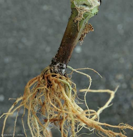 La causa de este marchitamiento se encuentra en el cuello de los tallos del melón. Aquí se ha desarrollado una lesión húmeda, una pudrición que ha ido ganando progresivamente la parte inferior del tallo y la raíz principal, pero también la parte superior del sistema radicular (figura 1). En el cuello , los tejidos alterados están húmedos y muestran un tinte de oscuro a parduzco. Esta lesión acaba rodeando la varilla durante varios centímetros (figura 2). Las raíces situados en el mismo estrato del suelo también se ven afectados (Figura 3). Su corteza se vuelve amarilla, marrón y se descompone.