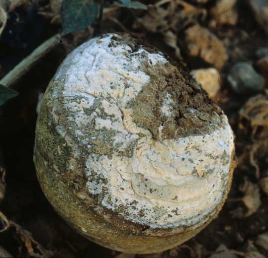 Los frutos también son atacados (figura 5): se desarrolla una podredumbre húmeda y blanda en la parte en contacto con el suelo. El tejido alterado también adquiere un tinte oscuro.