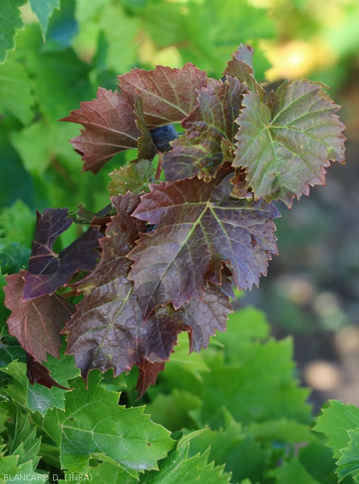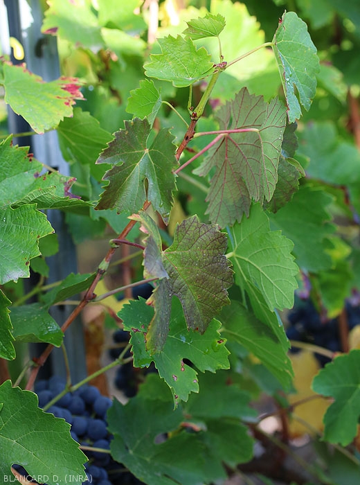 La hembra realiza una incisión levemente curvada y larga de unos 5 a 7 mm en la dirección del largo de la rama para depositar sus huevos, incisión que dificulta la circulación de la savia, terminando a finales del verano con la formación de un "traumático mancha roja "de la parte posterior de la rama (enrojecimiento de las hojas) . La formación de una cicatriz negra (figura 1) debido a la reacción del cambium a las picaduras de oviposición da como resultado el "enrojecimiento" del extremo de la rama, debido a la interrupción del flujo del floema de las hojas a la vid ( figuras 2 a 7). Las hojas también pueden curvarse alrededor de los bordes que, en las variedades de uva tinta, recuerdan los síntomas de la flavescencia dorée.