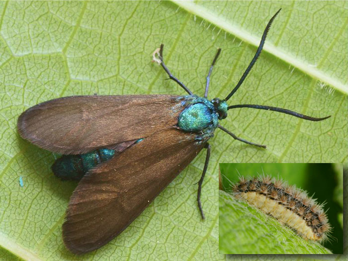 - Theresimima ampellophaga (Bayle-Barelle, 1808), la vid zygène o la vid procris (anc. Zygaena ampellophaga, foto 8) se conoce desde la antigüedad como una plaga del viñedo, pero que es de especial preocupación en el centro de Europa. En Francia su presencia se limita a la Provenza y el daño no es grave. Las pequeñas orugas comen los brotes jóvenes en la primavera y luego las hojas en crecimiento, atacando el medio de la lámina de la hoja.