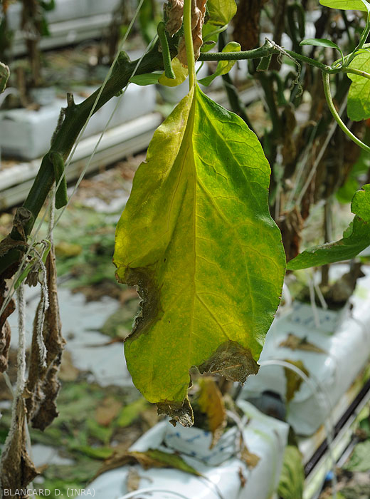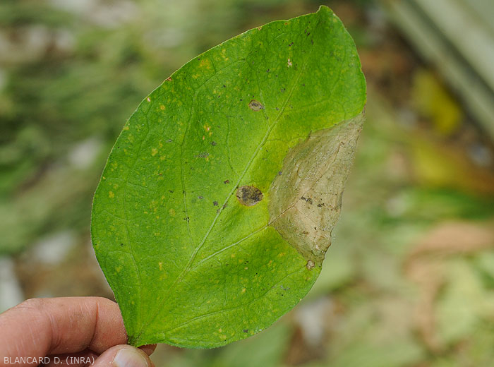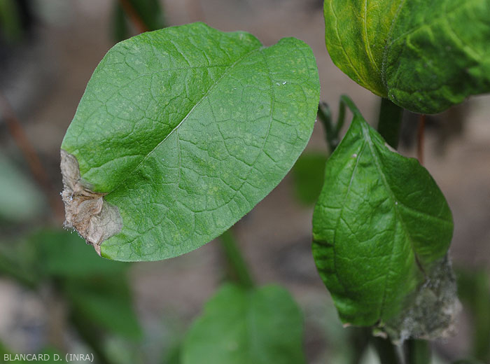 Manchas foliares grandes, más bien circulares y húmedas , que un adquieren tinte de beige a marrón. Estos se inician especialmente en el borde del limbo o por diversas lesiones. Eventualmente, los folletos pueden destruirse por completo.