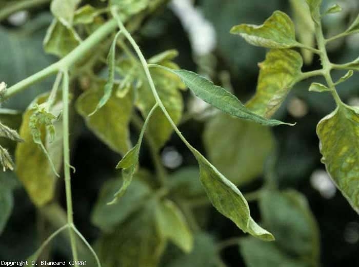 Légère marbrure et une mosaïque plus ou moins marquée sur les folioles. Celles-ci sont parfois filiformes en périodes de faible luminosité (figures 1 et 2). Virus souvent incriminé à la place du ToMV qui est mieux adapté à la tomate. |