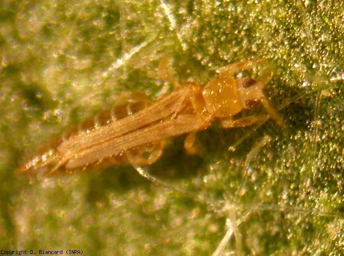 Les thrips (Thrips), qui appartiennent à l'ordre des Thysanoptères et à la famille des Thripidae, sont mondialement répartis, présents des régions tropicales aux régions polaires en fonction des espèces. Plusieurs d'entre elles s'attaquent aux cultures légumières, en particulier le thrips du tabac (Thrips tabaci Lindeman) et le thrips californien (Frankliniella occidentalisPergande (figure 1). Le premier sévit depuis de nombreuses années en Europe et donc en France. Il a été progressivement supplanté par le second qui a causé des dégâts importants sur de nombreuses productions, en particulier sous serres, depuis le début des années 1980 (concombre, poivron, melon, aubergine, chrysanthème, rosier…). Ces deux thrips peuvent s'attaquer à la tomate. Signalons qu'ils sont vecteurs de plusieurs redoutables virus, en particulier le Tomato spotted wilt virus. D'autres espèces de thrips s'attaquent à la tomate, Thrips palmi Karny, Heliothrips haemorrhoidalis (Bouché), Frankliniella spp., etc.