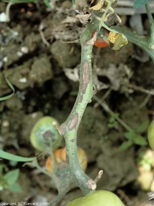 Alternaria tomatophila est à l'origine de lésions brun sombre à noires sur les pédoncules floraux ainsi que sur les pétioles et les tiges. Ces lésions sont plutôt allongées, présentent des anneaux concentriques et sont plus claires en leur centre (figure 1). Elles peuvent ceinturer la tige et entraîner le dépérissement de la partie distale du rameau (voir le chapitre Taches sur feuilles). Soulignons que des conidies peuvent se former sur les tissus altérés (figure 2)
