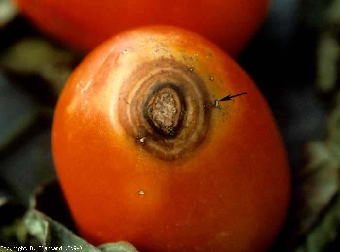 Ce champignon, responsable du mildiou terrestre, affecte essentiellement les Racines, le Collet, mais aussi les fruits de la tomate au contact du sol. Il provoque sur ces derniers des taches brunâtres qui s'étendent progressivement sous la forme de portions d'anneaux bruns, plus ou moins réguliers, diffus et concentriques, envahissant progressivement les fruits (buckeye rot) (figure 3). Lorsque les conditions sont très humides, le mycélium peut se développer en surface, sous la forme d'un feutrage cotonneux blanc (voir le chapitre Anomalies de coloration des fruits). Signalons que des confusions de diagnostic sur fruits peuvent parfois avoir lieu avec le mildiou aérien, surtout en situation de cultures non tuteurées (sur les différences entre ces deux mildious, consulter à nouveau ce chapitre Anomalies de coloration des fruits).