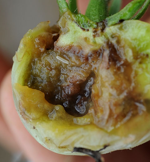 Los frutos afectados presentan pinchazos correspondientes a picaduras de adultos; generalmente son claramente visibles (Figuras 6 y 7). Paralelamente al desarrollo y daño ligado a la actividad de los gusanos, los frutos son colonizados por diversas plagas patógenas u oportunistas que progresivamente hacen que se pudran (Figuras 8 a 10). En Mayotte, esta especie causa un daño significativo a los tomates, que puede afectar la mayor parte de la cosecha si no se trata.