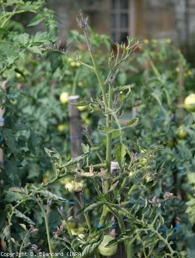 Los fitoplasmas que atacan al tomate provocan diversos síntomas en los órganos aéreos, jóvenes y en crecimiento, de esta solanácea. En Francia, a menudo aparecen durante el mes de julio o incluso a principios de agosto. A partir de este período, el crecimiento de las plantas afectadas a menudo se ralentiza . Los ápices forman entrenudos más cortos y hojas más pequeñas, a veces enrolladas. Los tejidos de la lámina suelen ser más gruesos e incluso quebradizos (Figuras 1 a 3).
