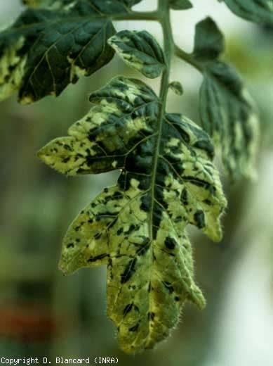 Los síntomas causados ​​por el del TMV varían según la cepa. Podemos observar en los folíolos y hojas un ligero moteado, un mosaico de verde a amarillo (Figuras 1 a 3). En condiciones invernales, se producen deformaciones de las hojas. El ancho de los folletos se reduce considerablemente, en este caso hablaremos de "filiformie" (figuras 4 y 5).