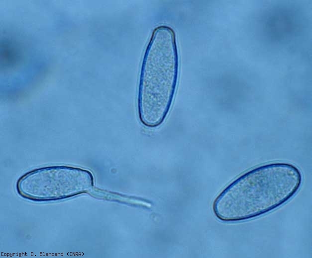 A los pocos días de la contaminación, conidióforos cortos emergen en hifas secundarias formadas en la superficie de la lámina y producen conidios (Figura 2). La esporulación es muy abundante (Figuras 3 y 4). Los conidios (figura 5) son bastante frágiles y solo viven unas pocas horas, o incluso unos días, cuando las condiciones son favorables. Son muy ligeros y, por tanto, son fácilmente transportados y dispersados por el viento , y de paso por la lluvia o por salpicaduras durante el riego por aspersión.