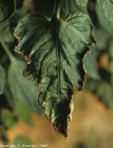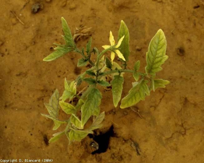 Las hojas inferiores se ven especialmente afectadas: de un amarillo más marcado, pueden acabar cayendo. Se pueden observar diferencias de sensibilidad entre cultivares.