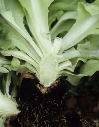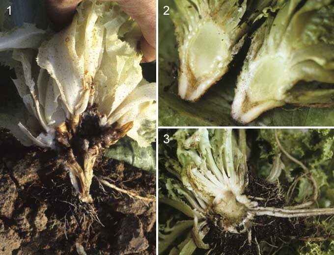 Généralement, les vaisseaux, lorsqu'ils sont colonisés, jaunissent et brunissent plus ou moins ; les tissus contigus, comme le cortex ou la moelle, sont parfois affectés. Dans les figures 2 à 5, vous pouvez observer quelques exemples d'altérations intervenant sur et dans le pivot et la tige des salades.