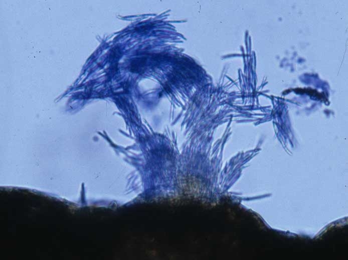Manchas foliares irregulares, cloróticas, delimitadas por nervaduras, marrones, a veces muy anchas cuando confluyen (figura 1). Un halo amarillo los rodea (figura 2). Están salpicadas de numerosos picnidios que contienen esporas hialinas generalmente filiformes con una a tres particiones (figura 3). El centro del tejido necrótico se rompe, dejando las hojas cubiertas de agujeros. Estas manchas se desarrollan principalmente en hojas viejas (Figura 4).