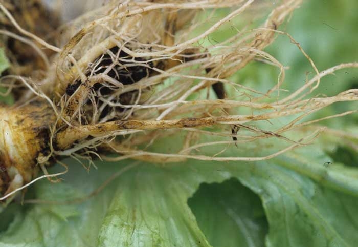 El pivote suele verse muy afectado; está fuertemente suberizado y agrandado y se vuelve quebradizo (figura 7). En última instancia, solo una pequeña porción de la raíz principal y algunas raíces adventicias recién formadas a nivel de la corona permanecen en las plantas, y muchas raíces dañadas han desaparecido.