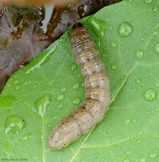Larvas de 3,5-4,5 cm de largo, grisáceas y de apariencia opaca. Cabeza negra, pequeña y poco llamativa (figura 3). |