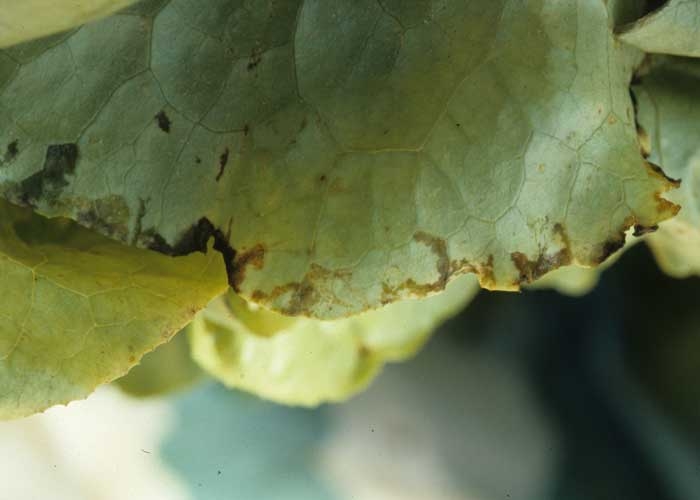 - des bactéries saprophytes, opportunistes, profitant d'un affaiblissement des plantes, de tissus nécrosés (dus par exemple aux nécroses marginales), pour coloniser les feuilles. Elles entraînent une pourriture brune à noire dont l'extension dépendra de l'humidité ambiante (Pseudomonas marginalis pv. marginalis, Pseudomonas viridiflava...).