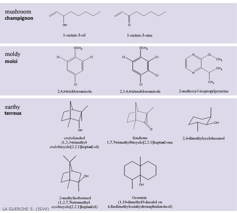 - plusieurs composés moisi-terreux : 2,4,6-trichloranisole (TCA) (goût de bouchon), 2,3,4,6-tetrachloroanisole (TeCA), 2-3,5-diméthylpyrazine (goût de moisi de certains bouchons en liège), géosmine (trans-1,10-diméthyl-trans-9-décalol), 2-méthylisobornéol… (MIB).
