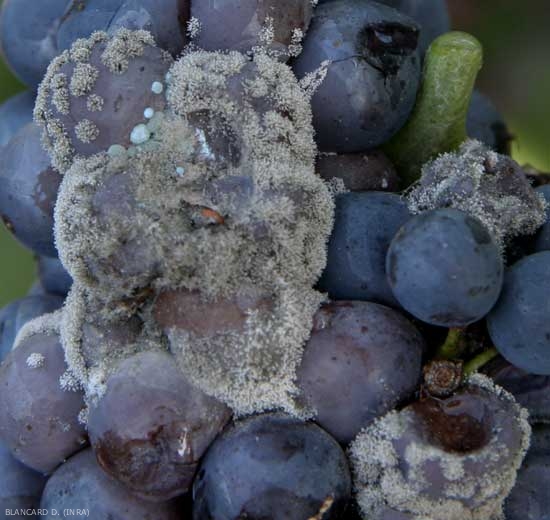 Nous insistons sur le fait que ces champignons sont fréquents dans certaines régions de production, mais qu'ils passent souvent inaperçus au coeur des grappes botrytisées. L'ouverture de plusieurs grappes permet plus facilement d'apprécier le phénomène.  De plus, soulignons aussi l'association forte mise en évidence au vignoble entre la présence de géosmine au coeur des grappes, le développement plus ou moins important de B. cinerea sur celles-ci, et l'envahissement secondaire de ces dernières par des Penicillium spp., et notamment par  P. expansum.