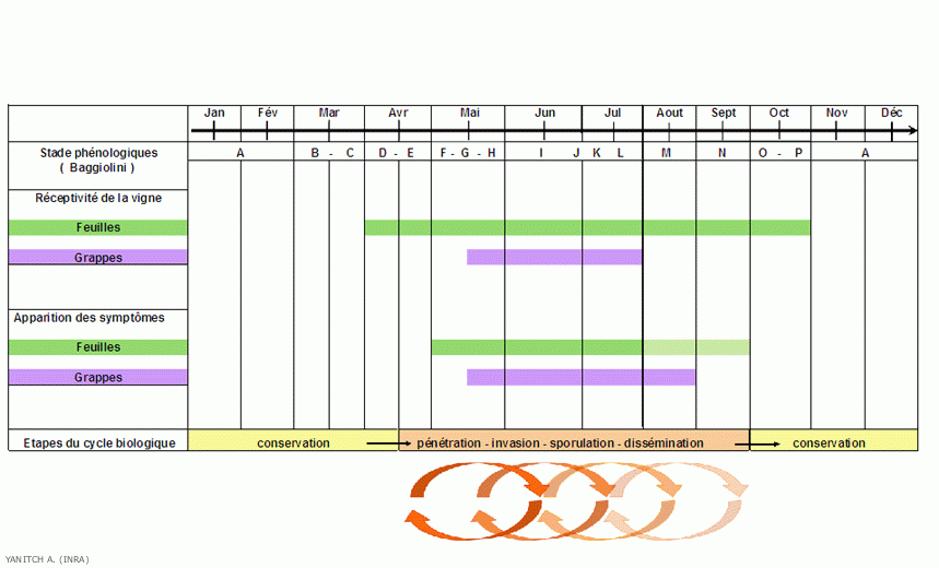 Agreguemos que estos huevos de invierno se pueden conservar durante varios años en suelos vitivinícolas. Las contaminaciones primarias pueden tener lugar durante todo el período vegetativo de la vid.