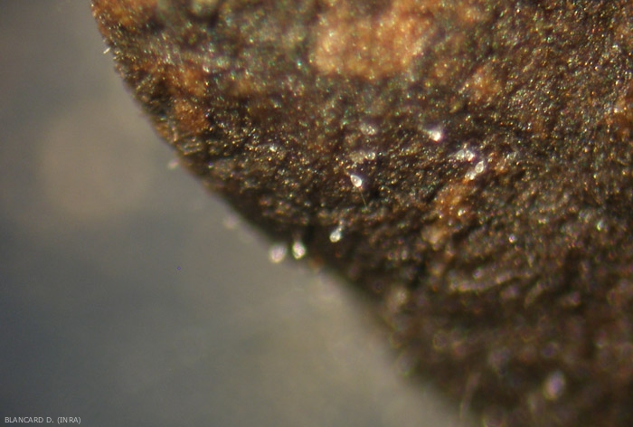 En la mayoría de los órganos afectados, P. viticola forma arbuscules que emergen a través de los estomas: los esporangióforos, al final de los cuales se producen esporangios (figura 6). Estas estructuras, cuando son numerosas, constituyen el fieltro blanco asociado a menudo con los síntomas del tizón tardío en los órganos de la vid (Figuras 7 a 9). Estos esporangios son diseminados principalmente por el viento cuando baja la humedad del aire. Pueden deberse a las salpicaduras que se producen durante las fuertes lluvias.