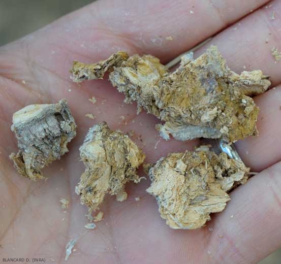 ** Los dos hongos pioneros, Phaeomoniella chlamydospora y y de Phaeoacremonium aleophilum las perforaciones negras , son responsables de la necrosis marrón central o sectorial visibles en las vides. menudo se aíslan otros hongos de la necrosis sectorial: varias especies de Botryosphaeria y, a veces, Agreguemos Eutypa lata, que a responsable de la eutipia.