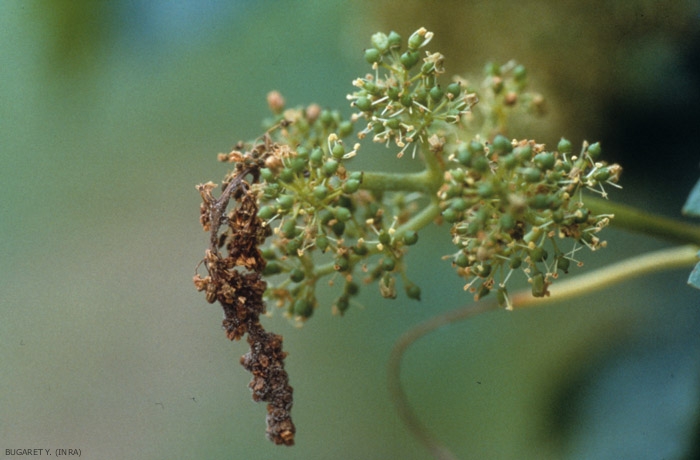 B. cinerea puede pudrirse y secar las inflorescencias que eventualmente se caen (Figura 3). Para ello coloniza los pétalos senescentes que son especialmente vulnerables. Utiliza estas últimas, pero también otras partes senescentes de flores o bayas abortadas como base nutritiva inicialmente, para asegurar posteriores infecciones en pedicelos, raquis y en frutos en particular. Los ataques de incursión son bastante específicos; dan como resultado el desarrollo de una lesión marrón, ennegreciéndose y extendiéndose gradualmente. Con el tiempo, el pedúnculo (figura 4), el raquis, algunos pedicelos terminan ceñidos y dejan de funcionar. En este caso, las bayas de uva aguas abajo pronto se marchitan, se marchitan y se caen. Estos síntomas se denominan pudrición del tallo.