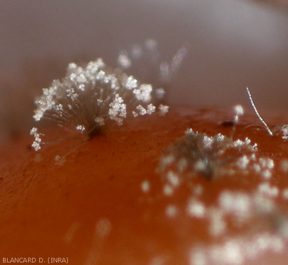 • El micelio de Botrytis cinerea , que mide alrededor de 12 µm de ancho, es cilíndrico y con bandas, de color marrón claro a oliva. Cuando se vuelve fructífero, el micelio forma largos conidióforos (figuras 1 y 2) al principio simples, luego se ramifican por una serie de ramas dispuestas perpendicularmente, al final de las cuales se forman conidios insertados en racimos (figura 3). Y transportados por esterigmas (figura 5).