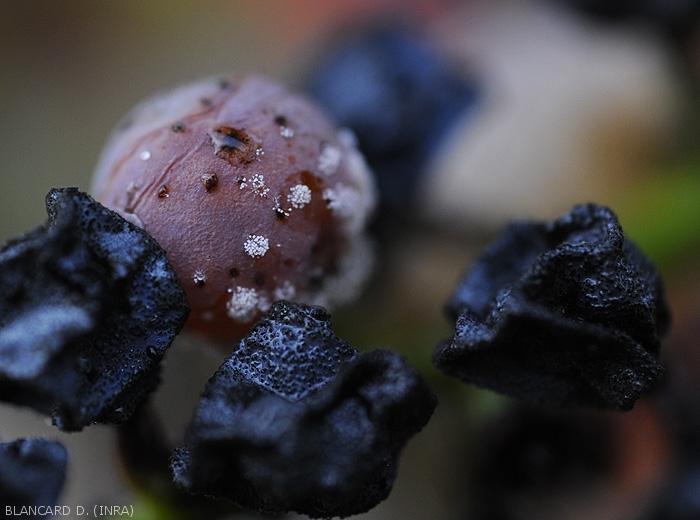 • Los esclerocios son la principal forma de conservación de Botrytis cinerea . Son pequeños, redondeados a ovoides, aplanados y miden de 2 a 5 mm de longitud. Primero son blancos y luego gradualmente se vuelven marrones (figura 8). Se observan pinchazos finos y regulares en su superficie.