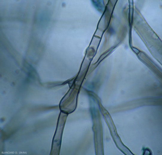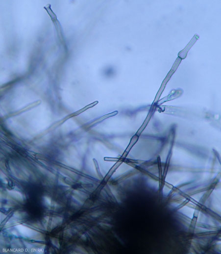 • Aspecto en medio de cultivo : este hongo crece muy rápidamente in vitro . Las colonias jóvenes son de apariencia blanca, fibrilada o vellosa; posteriormente, adquieren un color gris oscuro casi negro y un aspecto crujiente. El micelio velloso es muy característico porque presenta hinchazones a nivel de las particiones miceliales (Figuras 6 y 7). Es posible observar peritecios en culturas más antiguas.