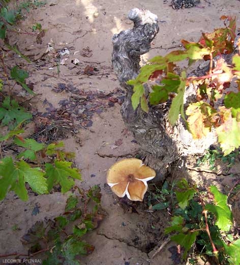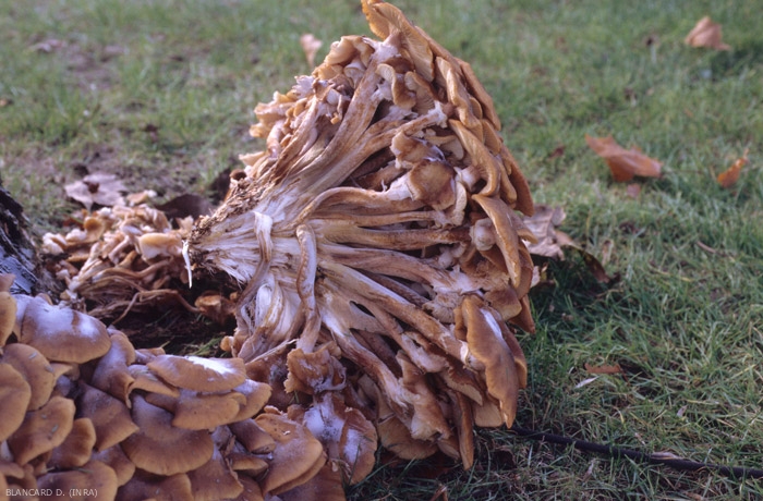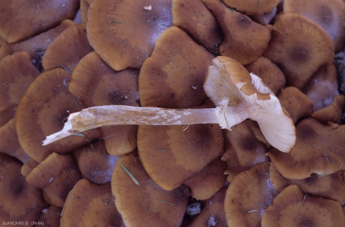 * Nótese que a finales de la década de 1970, la especie A. mellea, que luego agrupó todos los hongos responsables de la pudrición de las raíces en las diversas especies leñosas, se dividió en varias especies diferentes, incluidas cinco para Europa. Estas especies difieren en particular en su rango de hospedadores y requisitos ecológicos. El nombre de A. mellea se mantuvo para los armilares subordinados a los árboles de hoja caduca, incluida la vid. Armillaria ostoyae , que ataca a las coníferas, nunca se ve en las vides. Esto explica las observaciones hechas por los antiguos que observaron que las plantaciones de vid en los claros de coníferas fueron menos atacadas que las realizadas en los claros de frondosas.