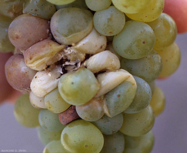 Las raras bayas infectadas con Aspergillus spp. son suaves y aburridos. Adoptan un color blanquecino en las variedades de uva blanca y más bien marrón en las tintas (figuras 1 a 6).