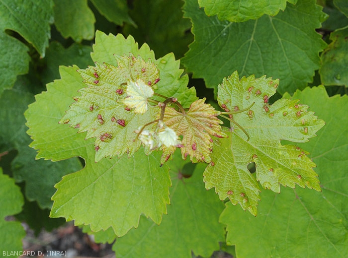 Las agallas formadas en las inflorescencias causan flacidez de las flores afectadas, pero esto es bastante raro. Los ataques a las ramitas pueden dar a las vides jóvenes una apariencia tupida, con brotes atrofiados que recuerdan los síntomas de los nudos cortos; las ramas formadas posteriormente no se pueden utilizar para la poda de formación. En las vides más viejas, los ataques son menos dañinos. A veces observamos una caída de hojas severamente atacadas.