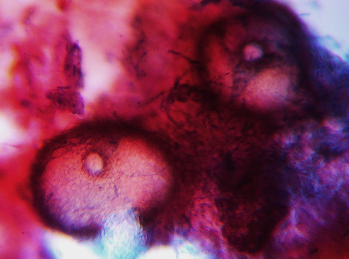 - La forma sexual (teleomórfica) de estos hongos rara vez se encuentra en la naturaleza. La figura 3 muestra el aspecto que puede tener la forma sexual de , por ejemplo Botryosphaeria parva . Las ascosporas producidas por los ascos contenidos en los peritecios son hialinas y asépticas al principio, se volverán ligeramente marrones y eventualmente se dividirán con la edad.