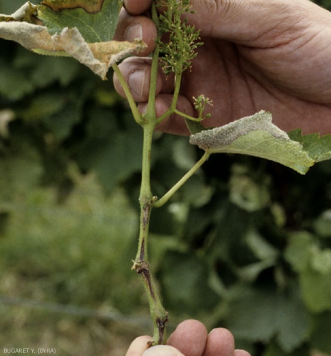 Los síntomas causados ​​por Xylophilus ampelinus aparecen principalmente en primavera y mediados del verano. Fluctúan según las cepas bacterianas, las variedades de uva, las técnicas de cultivo y las condiciones ambientales. Cabe señalar que la bacteria puede estar presente en estado latente en la vid, sin que esta última exprese ningún síntoma.